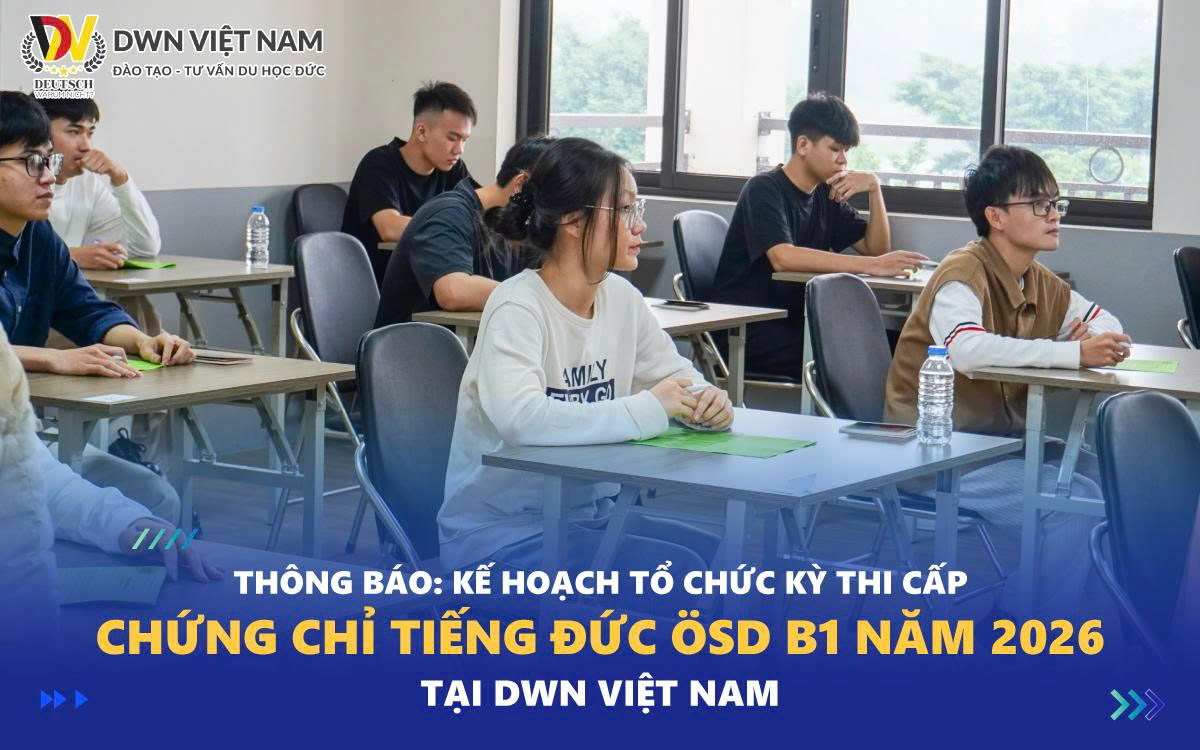 Công ty TNHH DWN Việt Nam chính thức thông báo tổ chức kỳ thi năng lực tiếng Đức ÖSD trình độ B1 tháng 3/2026. Đây là kỳ thi quan trọng dành cho thí sinh có nhu cầu hoàn thiện hồ sơ du học Đức, du học nghề Đức, làm việc và định cư tại Đức với chứng chỉ tiếng Đức được công nhận quốc tế.