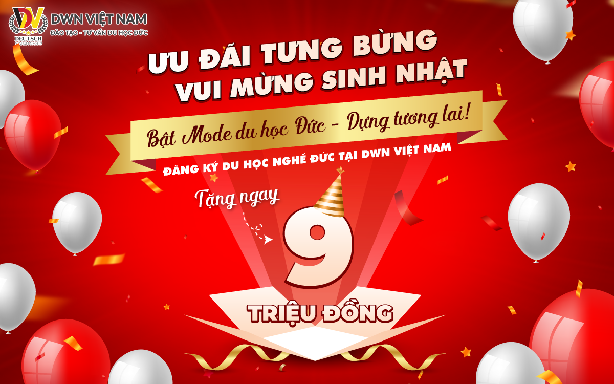 Nhân dịp kỷ niệm 9 năm thành lập, DWN Việt Nam triển khai chương trình ưu đãi đặc biệt trị giá 9.000.000 VNĐ dành cho học viên đăng ký các chương trình đào tạo tiếng Đức và du học nghề Đức tại DWN.
